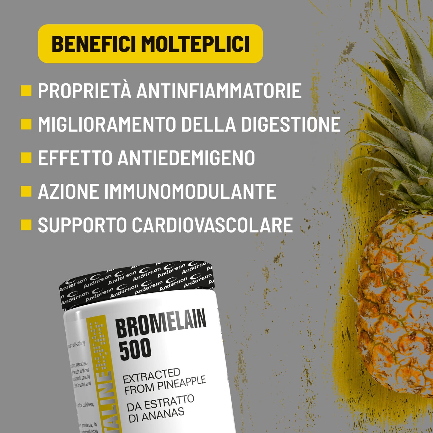 - Supporto cardiovascolare - Alcuni studi suggeriscono che la bromelina possa avere effetti benefici sulla salute cardiovascolare, contribuendo a prevenire l’aggregazione piastrinica.