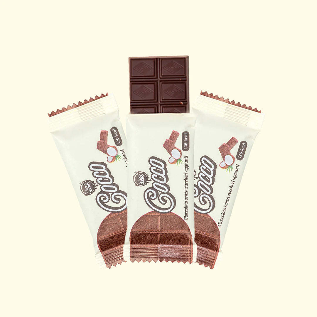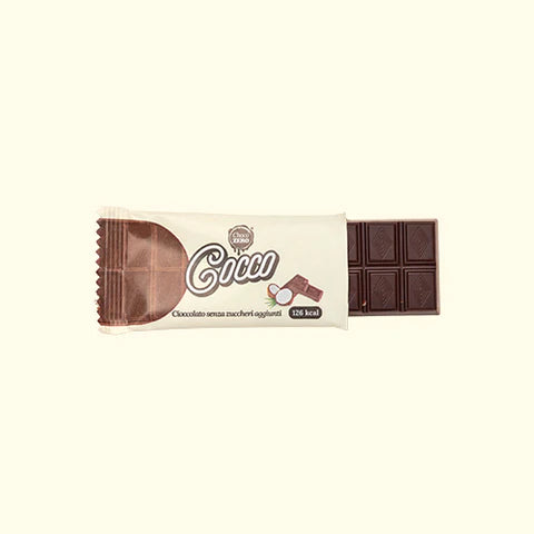 Scopri il gusto esotico delle tavolette al cocco con cioccolato artigianale, prive di zuccheri aggiunti.