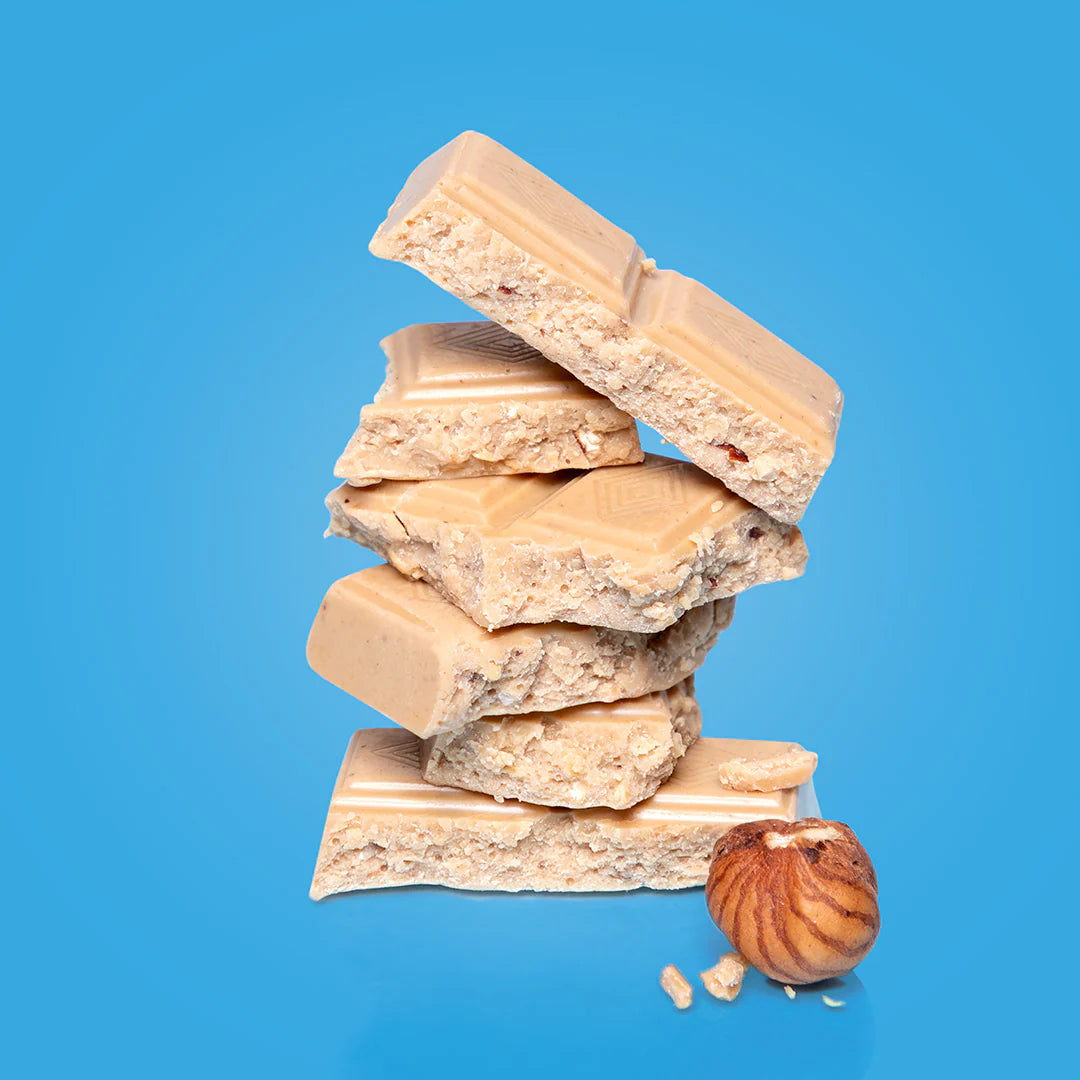 Con solamente 137 kcal per tavoletta, puoi goderti il piacere di questo cioccolato bianco con nocciole senza alcun senso di colpa.